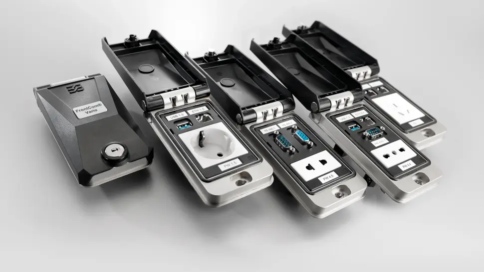 FrontCom Vario offers a portfolio of more than 5,000 combinations that supply tailored possibilities for virtually any application or lifecycle in a machine or system. The FrontCom Vario system takes account of the multitude of standards for communication interfaces in different designs, such as RJ45, USB, D-Sub (9 and 25 pole) HDMI, and HD15/VGA signal inserts. The online configurator allows you to easily design exactly the interface that you want.